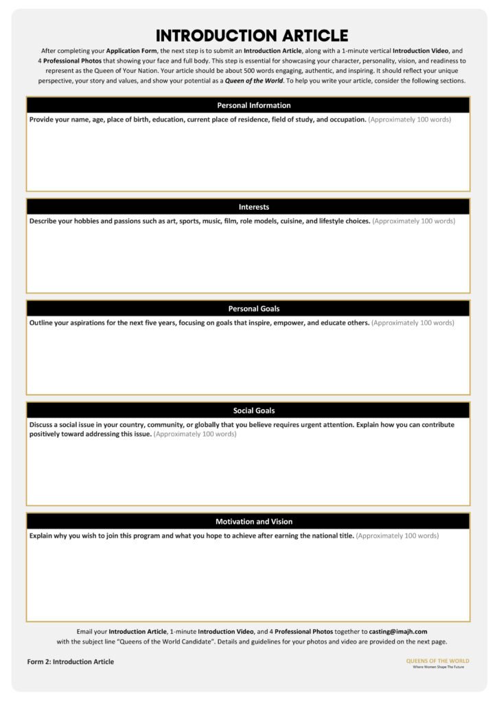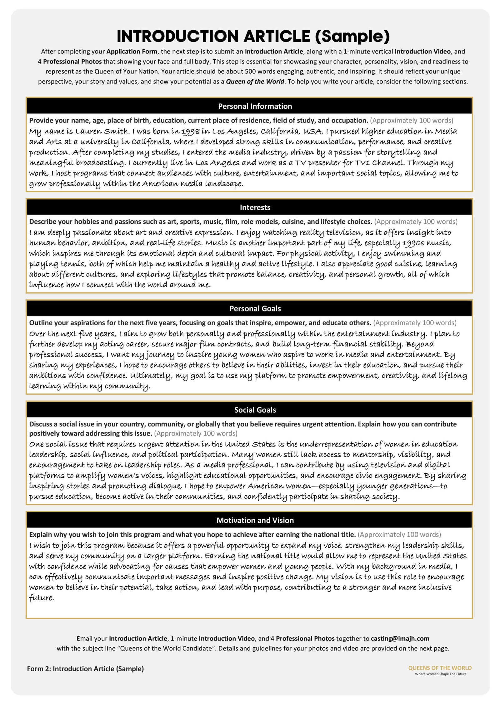 Write a short Introductory Article about your background, vision, and email it along with a 1-minute Introduction Video and 4 Professional Photos that highlight your appearance and physical beauty.