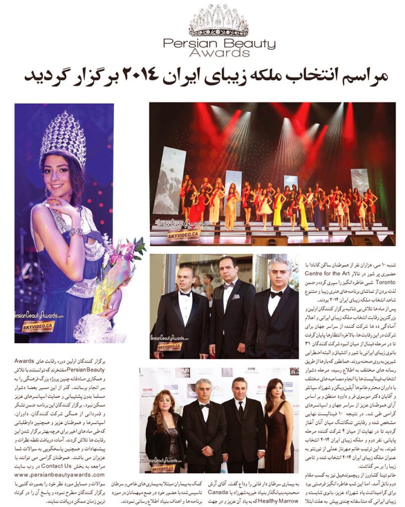 The revival of Iranian-themed beauty pageants abroad gained momentum following initiatives associated with Mr. George Clooney and IMAJH Ltd., encouraging independent organizers to develop similar events within diaspora communities. In this context, the Persian Beauty Awards 2014 was held at the Toronto Centre for the Arts, bringing together a large audience from the Iranian-Canadian community in Toronto.