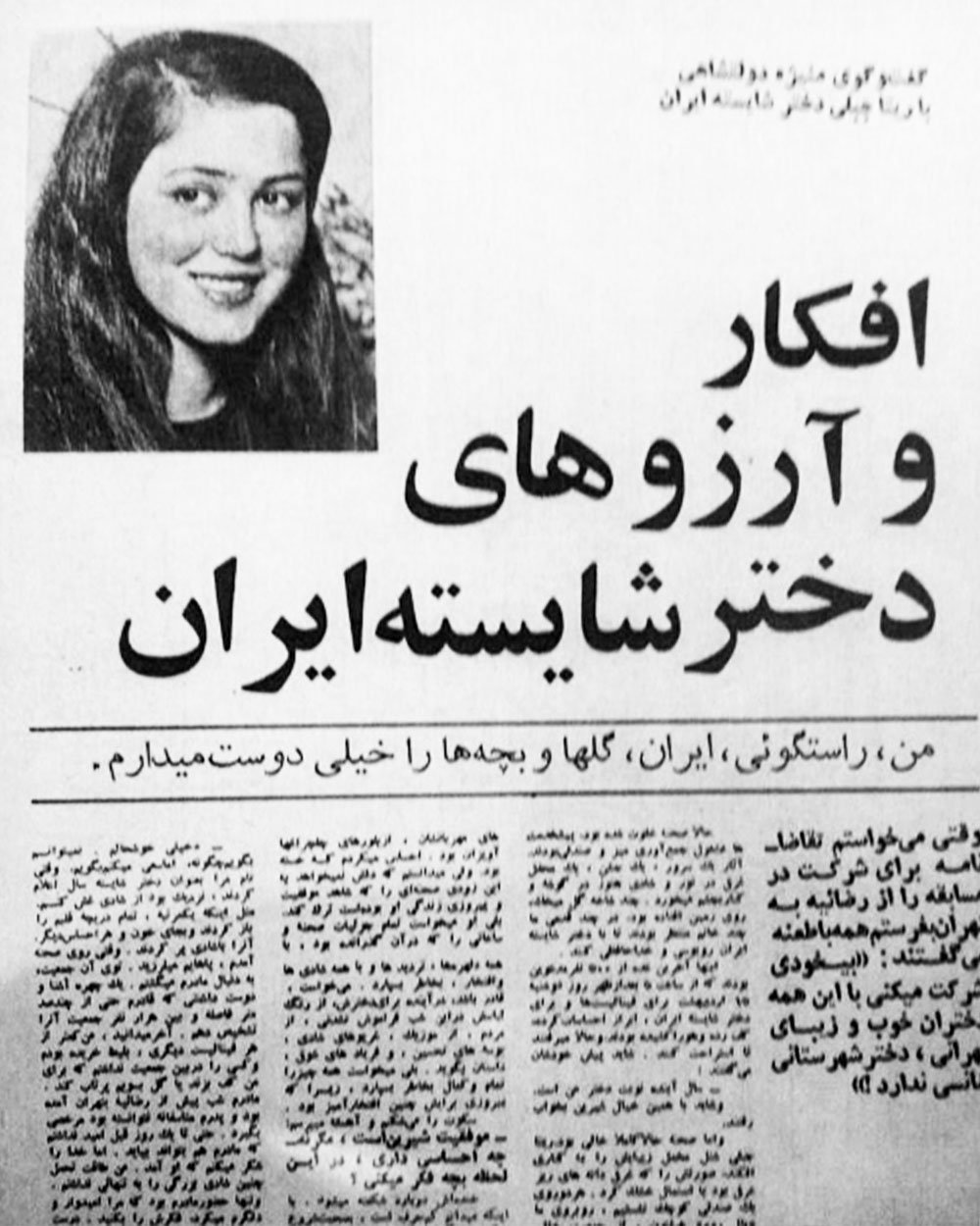 In 1969, Rita Jebelli was crowned Dokhtareh Shayesteh Iran (Worthy Girl of Iran). The pageant sought to project a contemporary image of Iranian womanhood—one defined by elegance, confidence, education, and the ability to represent the nation beyond its borders. Zan-e Rooz magazine prominently featured winners and finalists, publishing photographs, interviews, and personal profiles that captured the aspirations and spirit of the era while documenting a distinctive chapter in Iran’s cultural history.
